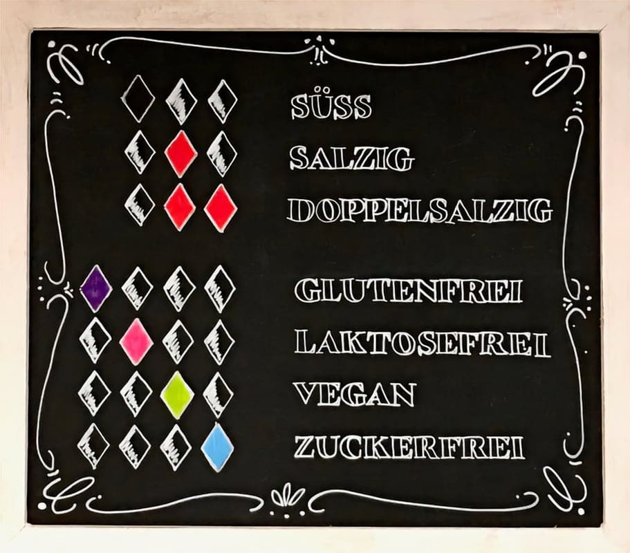 Jedes einzelne Laktrizteilchen bei uns ist gekennzeichnet. Die Kennzeichnung unterscheidet nicht nur die Geschmacksrichtungen süß und salzig, sondern zusätzlich auch vegan, gluten-, laktose-und zuckerfrei.