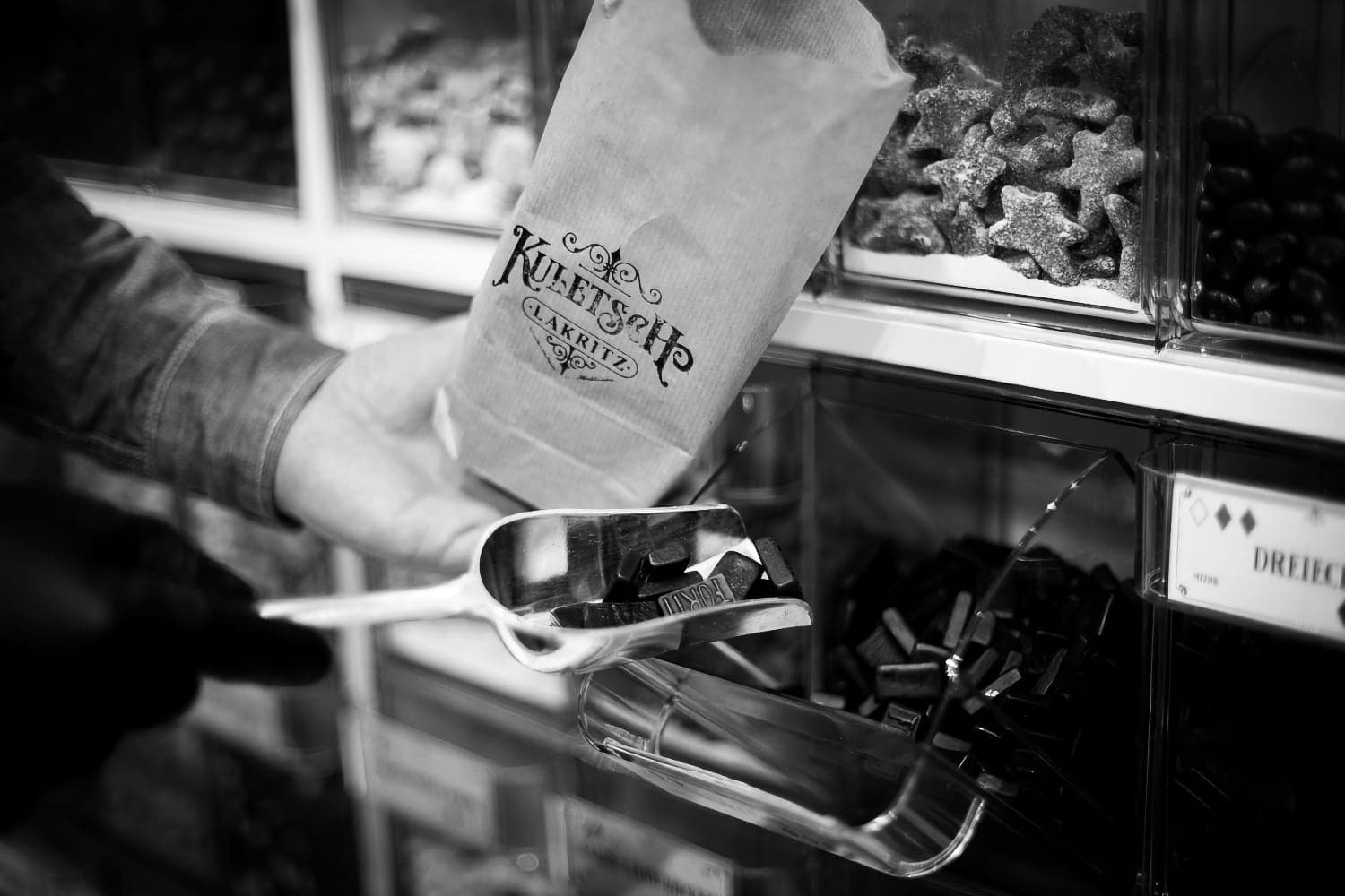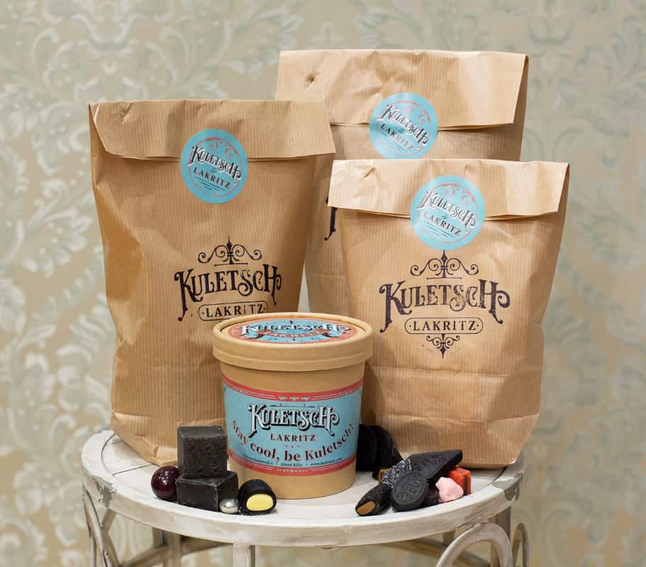Wir legen großen Wert auf nachhaltige Verpackungen. Deshalb findet ihr bei Kuletsch Papiertüten, Gläser, Dosen und wiederverwendbare Kartonbecher, in denen ihr euer Lakritz abpacken und nach Hause transportieren könnt.